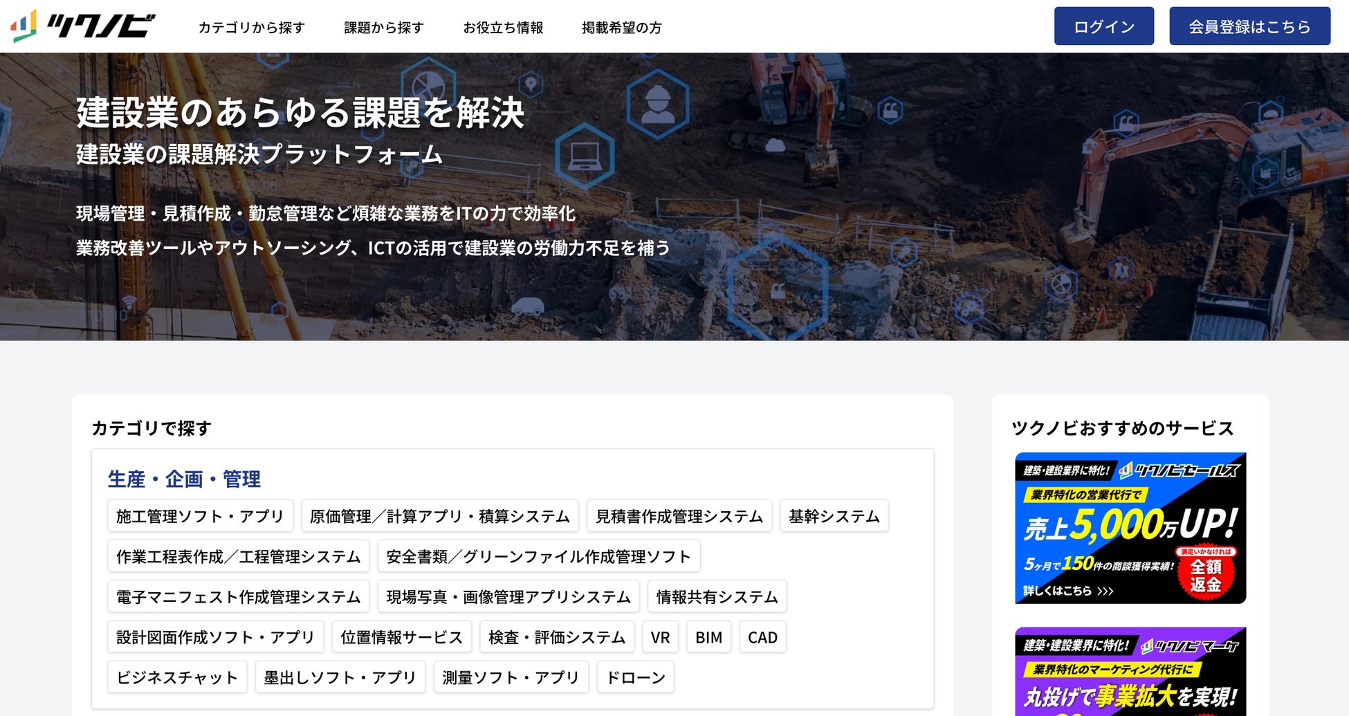 ツクノビは、建設会社の経営課題を解決するプラットフォームです。集客や業務改善、採用、技術などありとあらゆる建設業界における経営課題を解消できるヒントが見つかる場所です。